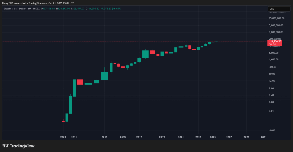 Zoom Out and Bitcoin Shows A Relentless March Higher (2009-2025, 6 Month Chart)