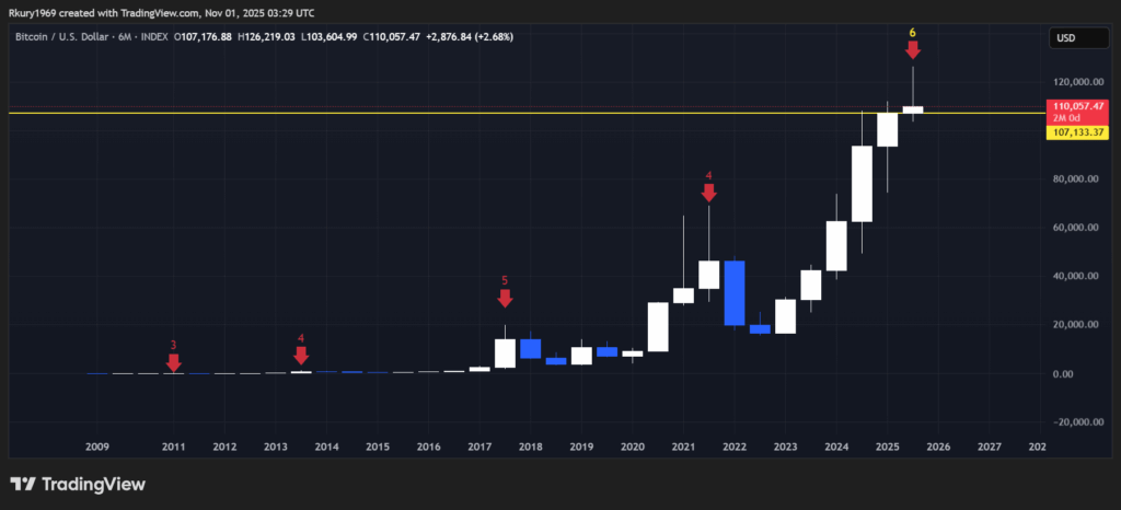So now we ask: Did the October 6th high mark the top of this cycle? It meets many criteria: extreme leverage, overheated psychology, stretched valuations. But there’s a twist. None of the 30+ traditional cycle‑top indicators have triggered. And the market’s sentiment is as subdued as it was in late 2022. Bitcoin just chalked up five consecutive six‑month candle closes and is currently trying to complete a 6th -an historic first if Bitcoin is above $107,200 on December 31st. That deviation alone will suggest something new is unfolding.